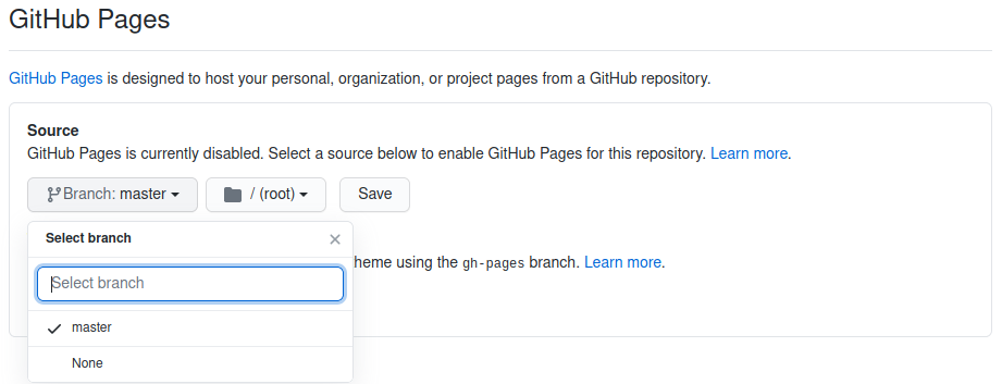 Baixa avall fins a la secció "GitHub Pages". Desplega on diu en l'apartat Source i selecciona la branca "master".